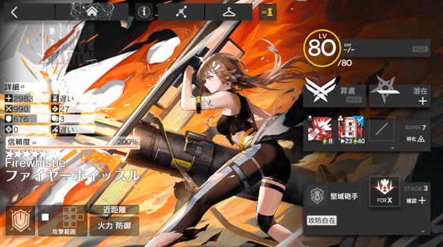そのうえで、彼女ならではの長所として、★5なので育てやすく、出撃コストが控えめという点がある。特に初心者~中級者の間は、「マップ中盤あたりでコストが溜まったらとりあえずファイヤーホイッスルを防衛ライン前に置き、援護射撃役&いざというときのブロック役にする」という運用をするだけでものすごく安定する。