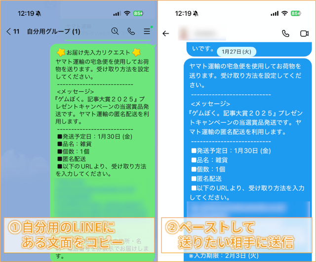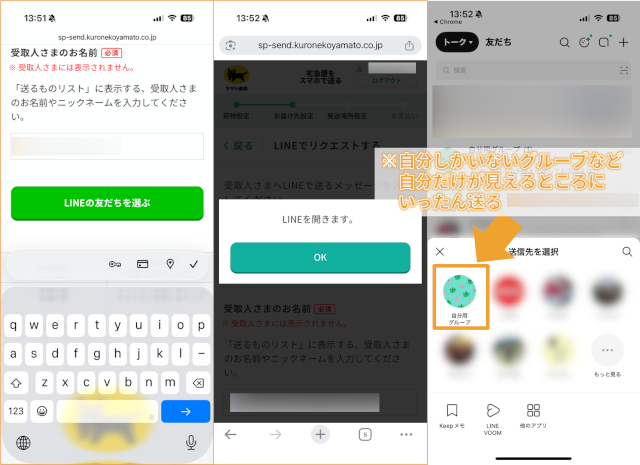 LINEを開いたあと、自分しかいないグループなど、自分だけが見えるところに受取情報入力用の文面&URLをいったん送ろう。