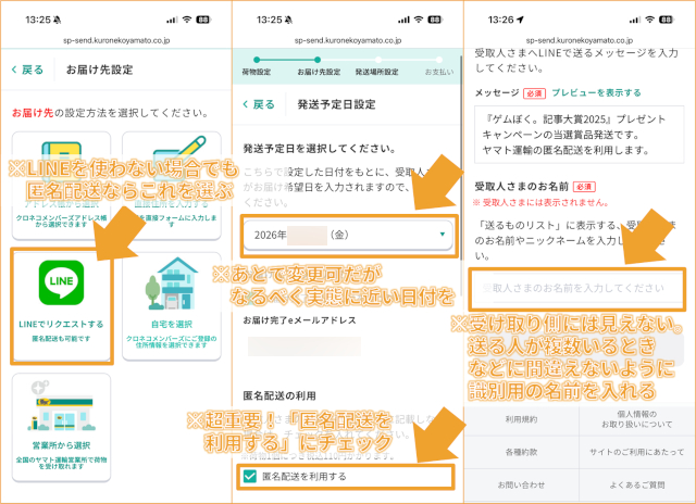 「LINEでリクエストする」を選ぶことと、その先の「匿名配送を利用する」にチェックを入れることを特に忘れないようにしよう。あとは難しいところはない。