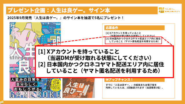 今回はプレゼント企画なので、応募条件にこれらを確認事項として明記しておくことで解決した。