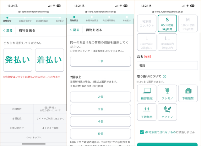 発払い(送る側が料金を払う)か着払い(受け取る側が料金を払う)かを選んだり、荷物の個数サイズを設定したりする。