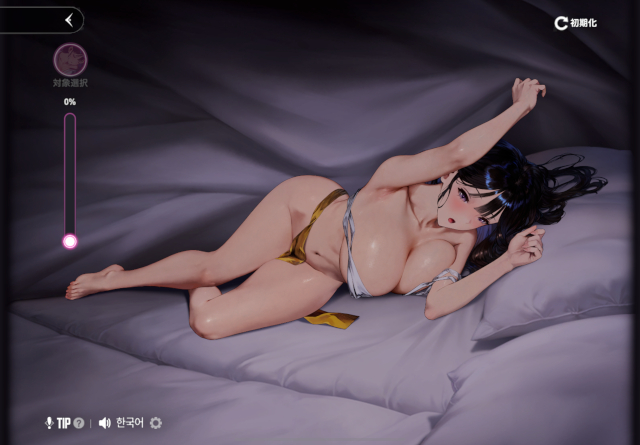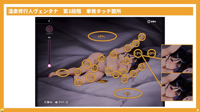 特徴は、「マイナス」の箇所、つまり触ると修行ゲージが減る部位があること。具体的には、胸、お尻、股間。明確なマイナス反応が見られるのはインタラクションでは珍しい。