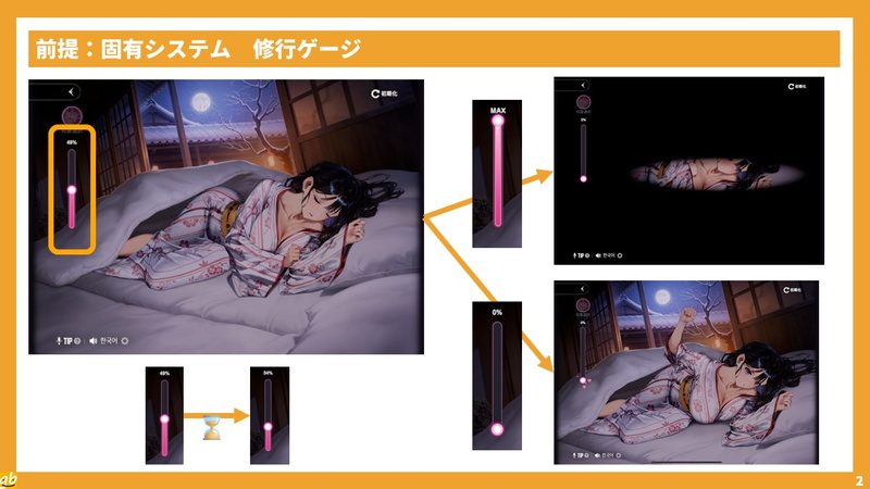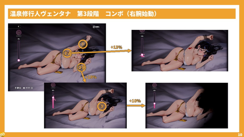 これは、0%からスタートして100%をめざしていくという点は享楽の探究者リベルタの享楽ゲージと似ているが、特定の箇所へのタッチや、時間経過によって減少することがあるのが大きな違い。