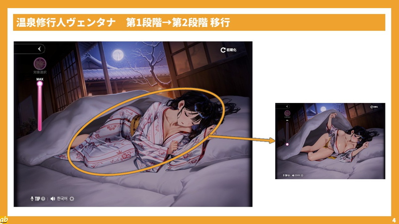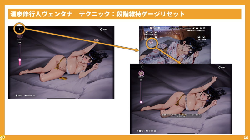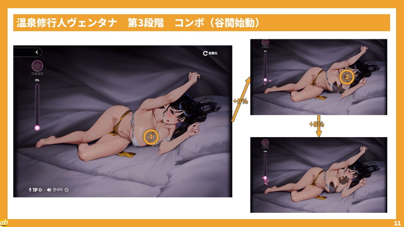 温泉修行人ヴェンタナのインタラクションは、固有ゲージがあるほか、第3段階を中心にタッチポイントが非常に多いので、すべてを逃さず見ようと思うとなかなか難度が高い。