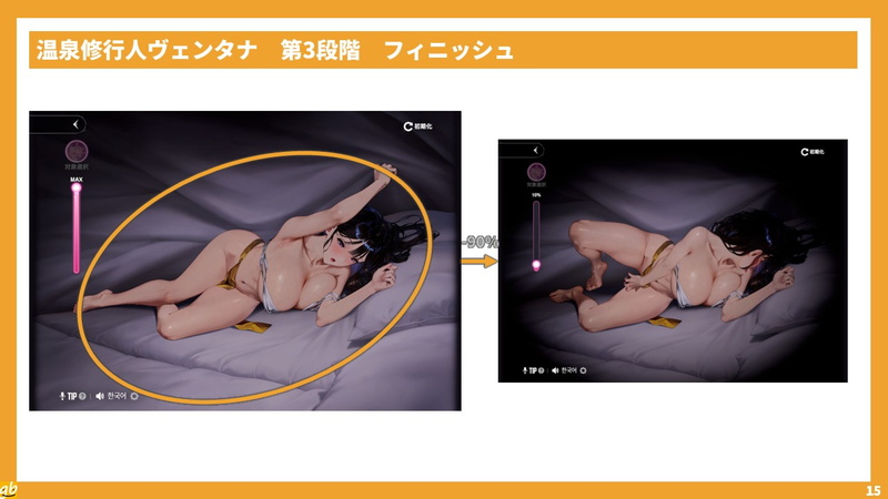 修行ゲージが100%の状態でヴェンタナまたは周辺の布団をタッチすると、フィニッシュ演出が入り、ヴェンタナが絶頂に達して修行ゲージを90%消費する。