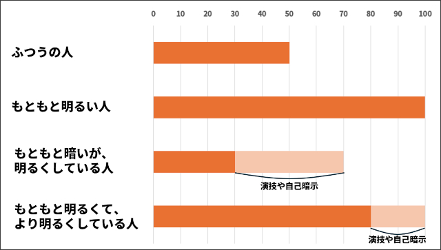 問題は、「もともと明るくて、より明るくしている人」。これは、もともと80の明るさを持つ人が、演技や自己暗示によって100に引き上げているパターンだ。
