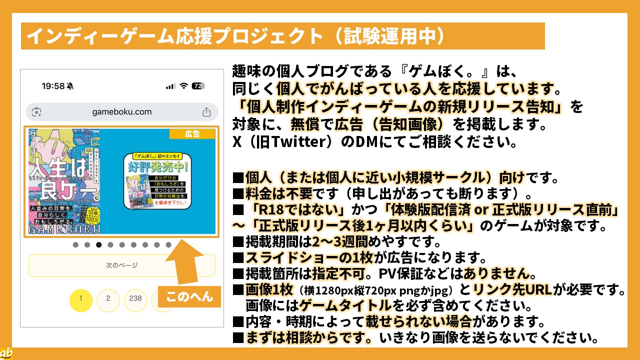 「ブログ『ゲムぼく。』内に広告欄を設立してのインディーゲームクリエイター応援企画。予想以上に依頼が多く好評なのはいいが依頼料タダだから本来想定していたメリットのうち企画の大本だった広告料によるブログ維持費の確保ができん」