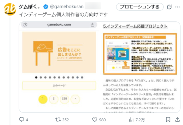 自分もゲムぼくの紹介で気になって遊んでみたゲームがわりとあるから広告を見て色んな人が色んなインディーゲーと出会う機会が増えるといいよね