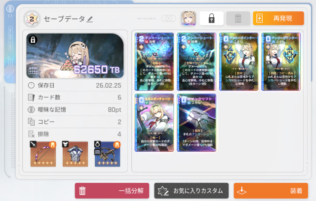 会心攻撃時手札に移動のアンカーシュート2枚、回収つきのアンカーポインターが2枚! 基本カードは排除して、エネルギーチャージも『強化』ヒラメキにできたので、デッキ圧縮もバッチリ! 装備も悪くない! うれしい~!
