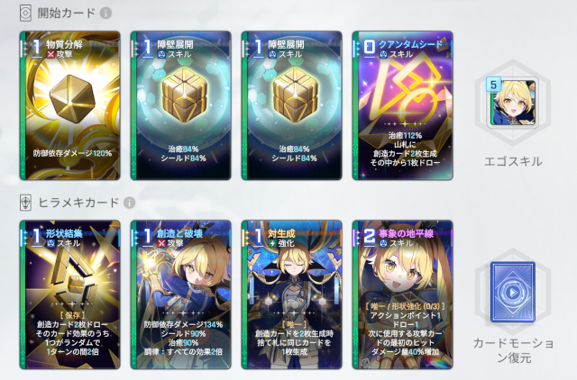 『物質分解』はカード排除してよい。『障壁展開』2枚も、めざす役割によってはカード排除してよさそう。