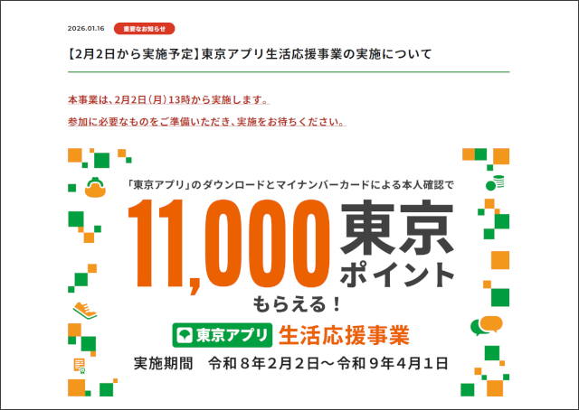 なんといまなら「東京アプリ生活応援事業」により、「東京アプリ」をダウンロードしてマイナンバーカードによる本人確認を行うことで、11,000東京ポイントがもらえちゃうんです!