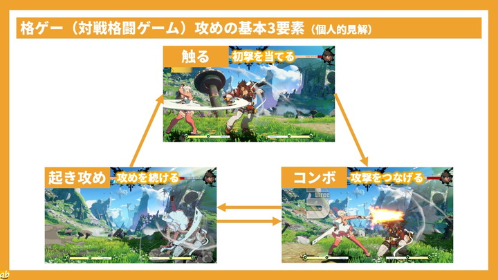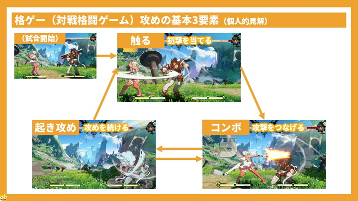初撃を当てる「触る」、そこから攻撃をつなげる「コンボ」、そこから攻めを続ける「起き攻め」。