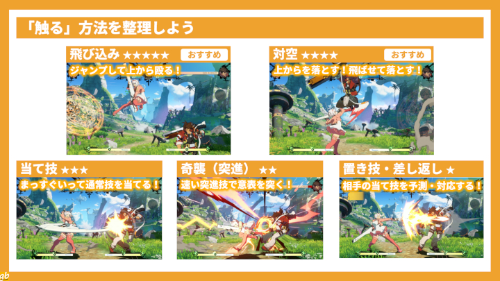 「おすすめ」にはだいぶ主観が入っているが、分類自体はある程度よくできていると思うし、多くの初心者にとっては「飛び込み」がいちばんカンタンで強くて「置き技・差し返し」がいちばん後回しでいいのはほぼ間違いないと思う。これは『ギルティギア ストライヴ』のエルフェルトに限らず、ほかの格ゲーやほかのキャラでも特殊な例を除けばある程度共通するだろう。