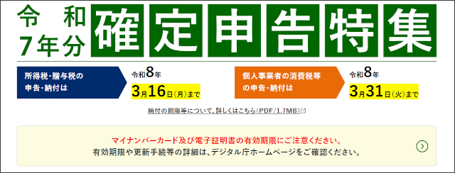 この2026年春に行う必要がある「令和7年分(2025年分)」の確定申告は、2026/03/16(月)が期限。