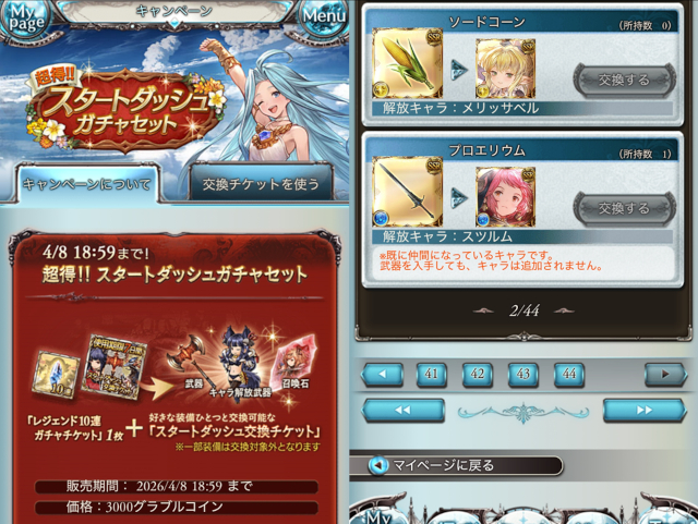 3000グラブルコイン(またはモバコイン)が必要だが、なんと『スタートダッシュ交換チケット』で数百人のラインナップから好きなキャラをひとり選んで確実に入手できる!