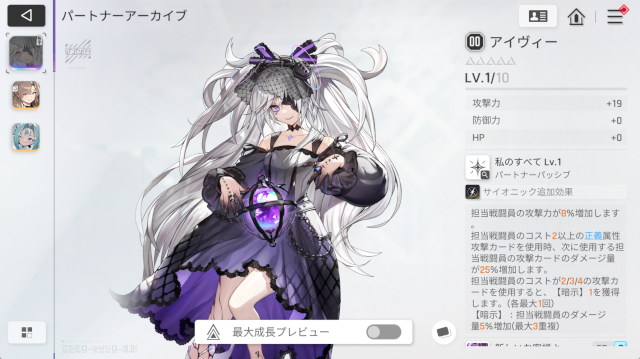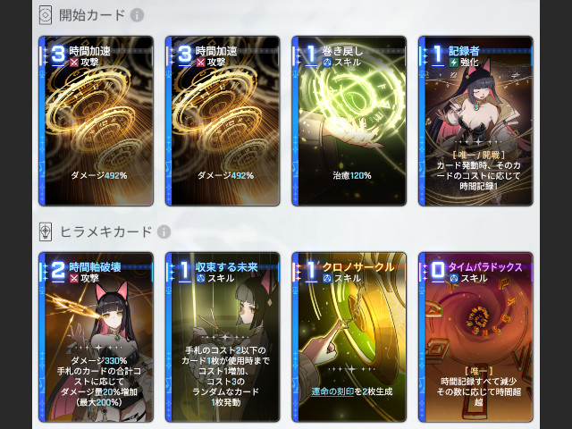 彼女は、サイオニックで、属性は『正義』。独自のギミックである「時間記録/時間超越」を使って、コストを踏み倒して高威力の攻撃を連発するアタッカーだ。