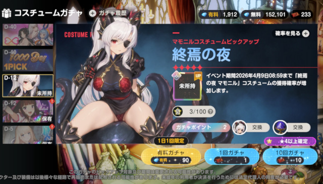 現在は『終焉の夜』というコスチュームがピックアップ中!