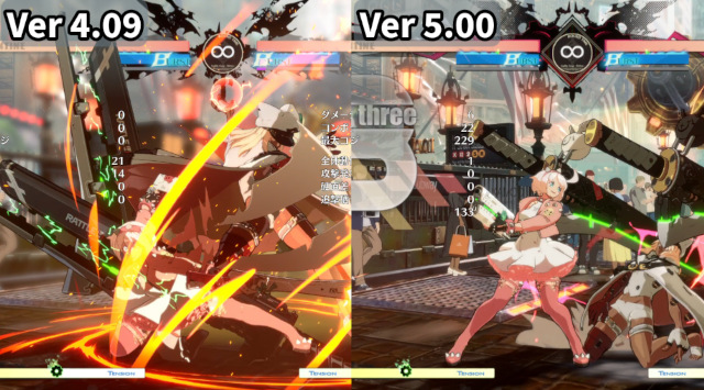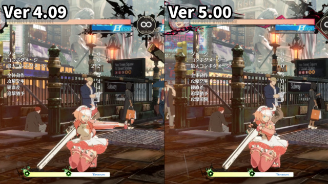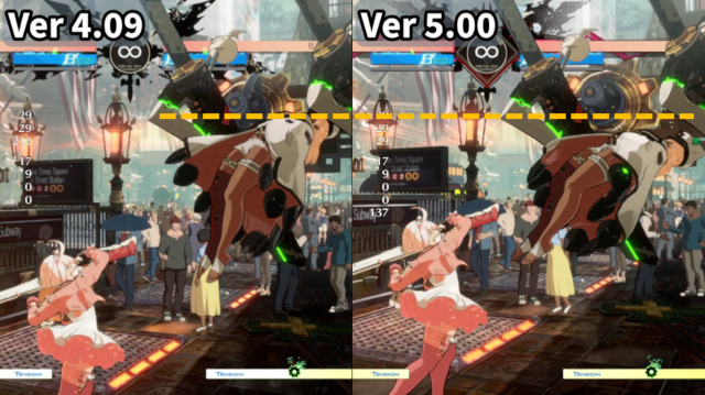 また、相手に当たった瞬間に強いブレーキがかかるようになったので、突進終了後に密着状態になることが少なくなった。上記画像は開幕距離から撃った際の比較。ガードされても投げをくらわない距離にいる。