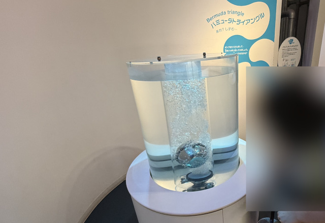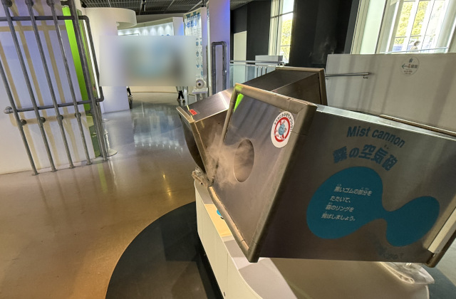 後ろをドンと叩くと、穴から白い霧が勢いよく飛び出す。この手の空気砲は白い煙が使われることが多いが、ここは水の科学館なので霧。くらうといい感じに肌がつやつやする。保湿に使えそう。