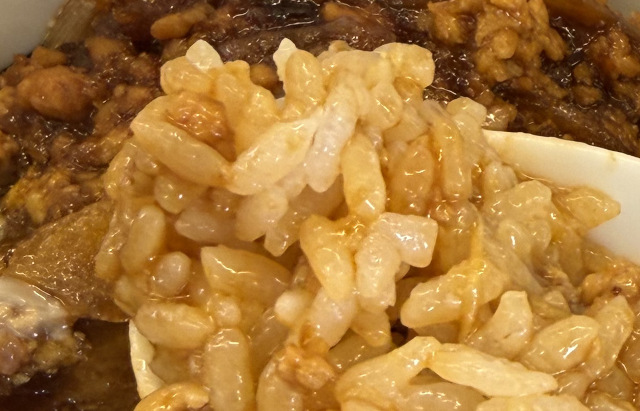 しかし、今回は肉あんかけが濃いタレの役割を果たしているので、底の底までドロッドロ! すべての米が肉と油でコーティングされて輝いている!