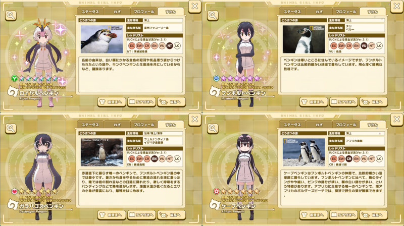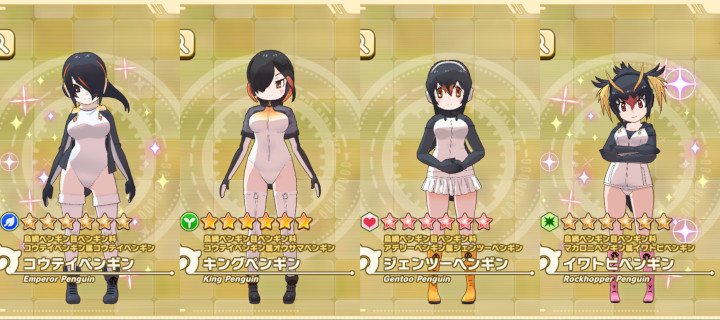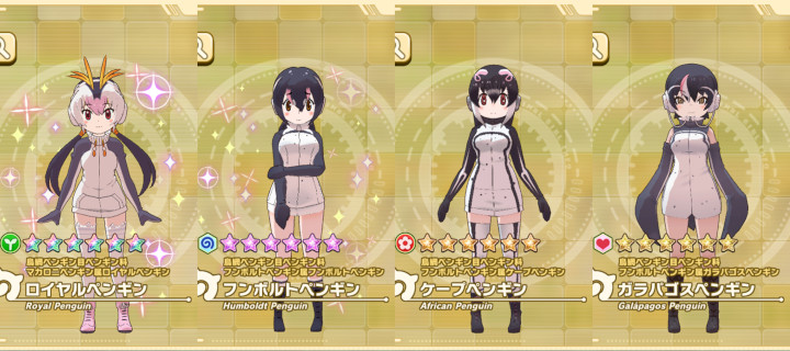 世界には現在17種のペンギンがいる(イワトビをキタ・ミナミに分けると18種いる)のだが、なんとそのうち10種をけもフレ3はカバーしている。17種すべてが登場する日もいつか来るかもしれない。