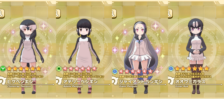 ロイヤルペンギン、フンボルトペンギン、ケープペンギン、ガラパゴスペンギン、コウテイペンギン、キングペンギン、ジェンツーペンギン、イワトビペンギン、ヒゲペンギン、アデリーペンギン、ジャイアントペンギン、オオウミガラス(けものフレンズ3)