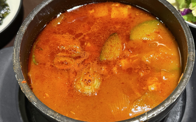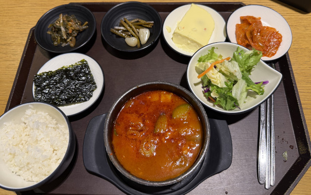 このチゲだけ食べ続けていると汗がボタボタ出るが、ご飯やサラダ、韓国海苔、卵蒸しなどもあるので、順番に食べていれば意外と大丈夫。しっかり完食!